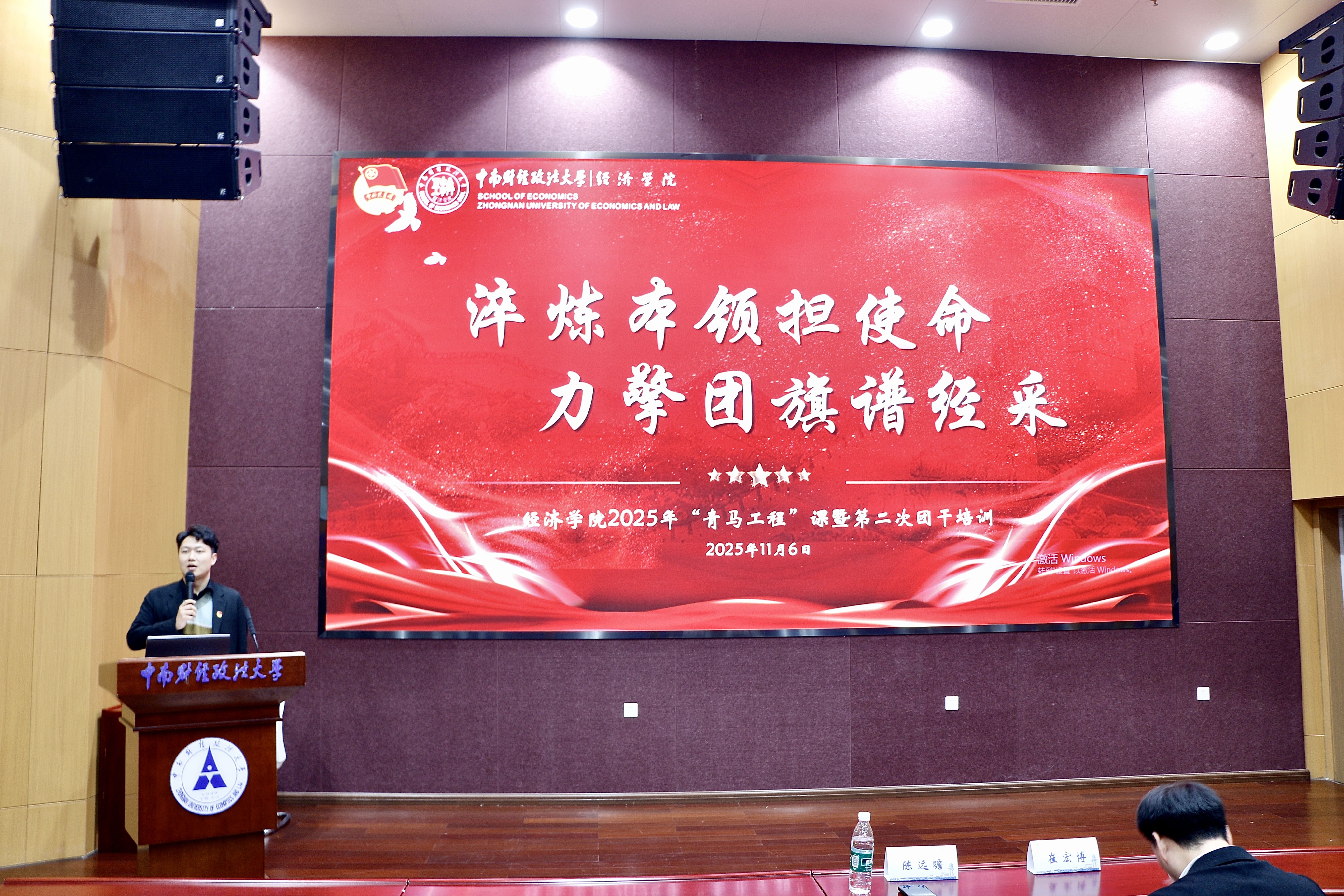 团歌奏毕,陈远瞻老师上台指导讲话,介绍了培训背景与目标。他指出,面对AI技术快速发展的时代浪潮,学生骨干需主动掌握智能工具应用能力,将技术优势转化为工作效能,推动团学工作内涵式发展。