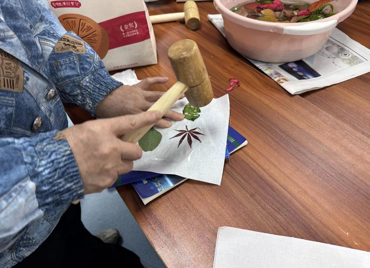 活动过程中,在志愿者的耐心协助下,老人们小心翼翼地将喜爱的花草置于布料之上,精心调整构图位置,再用小锤轻轻敲击。随着每一次敲击,植物汁液与天然纹理慢慢印于布面,将春日生机与自然之美定格成独一无二的手工作品。现场氛围温馨融洽、笑语不断,大家在动手创作与轻松交流中,拉近了志愿者与老人之间的距离,传递着温暖与关怀。