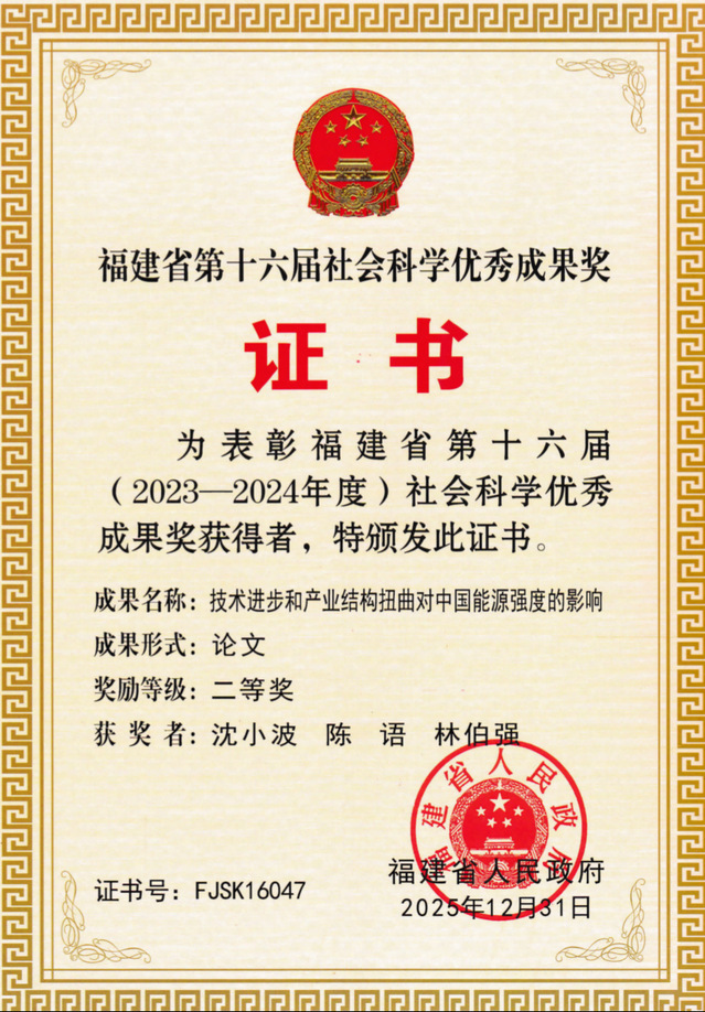 近日,福建省人民政府正式颁布《福建省人民政府关于颁发福建省第十六届社会科学优秀成果奖的决定》,禁漫天堂 陈语副教授合作发表于《经济研究》的论文《技术进步和产业结构扭曲对中国能源强度的影响》荣获福建省第十六届社会科学优秀成果奖二等奖。