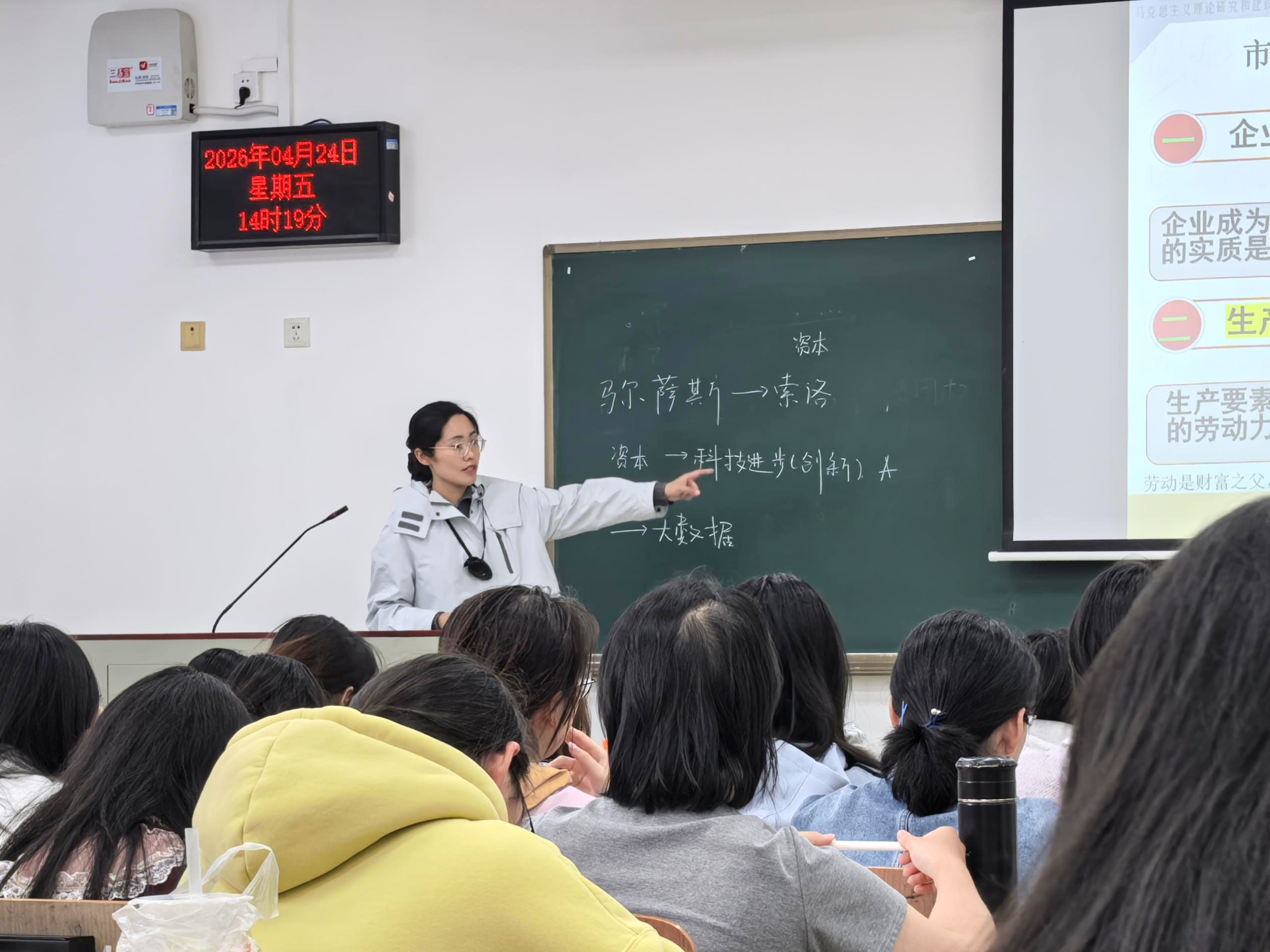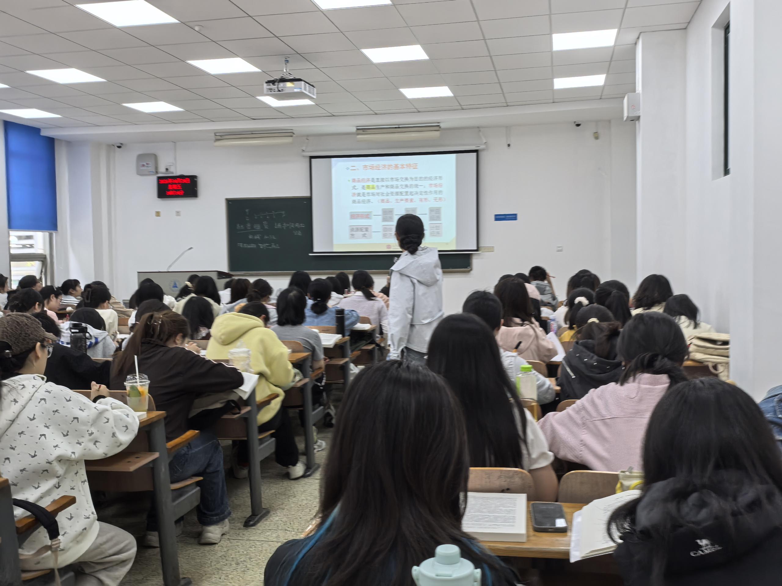 为深入落实立德树人根本任务,扎实推动习近平新时代中国特色社会主义思想进教材、进课堂、进头脑,紧扣 “十五五” 国民经济和社会发展规划纲要,深化思政课与专业教育深度融合,*禁漫天堂 持续开展2026年“同上一门思政课”系列活动。4月24日下午14:00-15:35,李业梅老师在文泰楼207教室,以政治经济学第三章《市场经济和价值规律》为授课内容,为本科生带来一堂兼具理论深度、时代高度与育人温度的思政融合课。