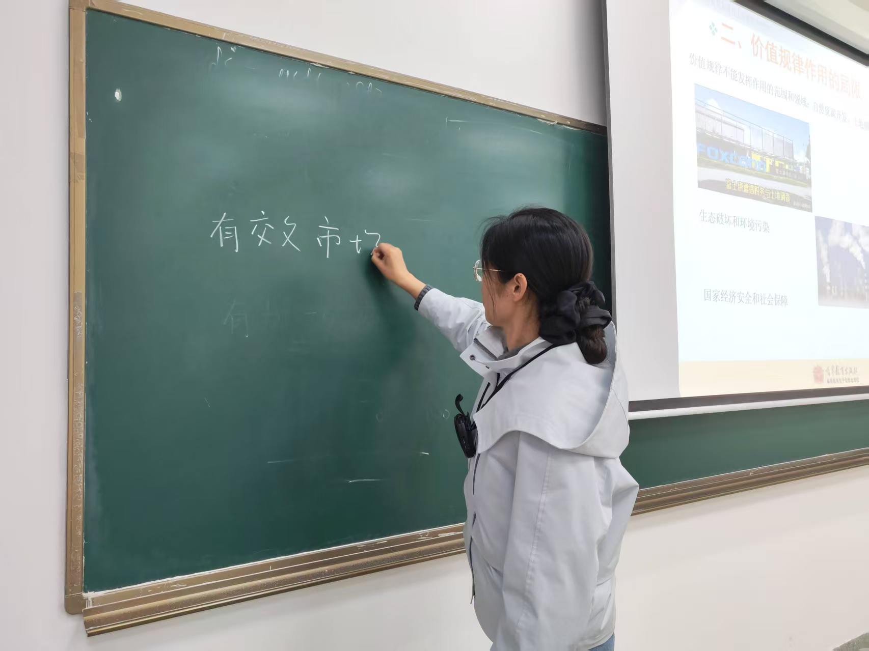 课程开篇,李老师立足人类社会经济形态演进,从自然经济、商品经济到市场经济的历史脉络,清晰阐释社会分工与独立经济利益是商品经济形成的两大关键条件,帮助学生把握经济发展的客观规律。在市场经济核心内容讲解中,李老师深入阐释习近平经济思想关于使市场在资源配置中起决定性作用、更好发挥政府作用的重要论述,结合“十五五”规划要求,系统讲解市场经济企业主体、市场配置、法制信用、开放包容、国家调节五大基本特征,用供求价格机制、竞争机制、风险机制三大市场机制,拆解市场运行逻辑,引导学生深刻认识我国社会主义市场经济体制的制度优势。