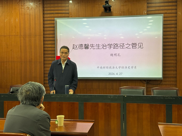 第三场讲座题为“赵德馨先生治学路径之管见”。魏明孔研究员以赵德馨先生七十余年的经济史教学与研究经历为主线,系统阐释了其“求真、求新、求用”的治学准则及其对中国经济史学科建设的重要贡献。魏研究员指出,赵先生研究视野贯通古今中外,从专业研究机构、专业刊物及栏目、专业学术团体、学科研究规范、综合性著作和人才培养制度等六个方面提出判断学科成熟的标准。在此基础上,赵先生又进一步概括出经济史实、经济史理论、经济史学理论、学科历史和学科工具书的“五个系统化”,为理解中国经济史学科的专业化进程提供了重要参照。魏明孔研究员还结合《中国经济史研究》、“中国经济史论坛”、中国经济史学会以及《中国经济史大辞典》等内容,阐述了赵先生在学术平台建设、知识体系建构和后辈培养中的重要作用。